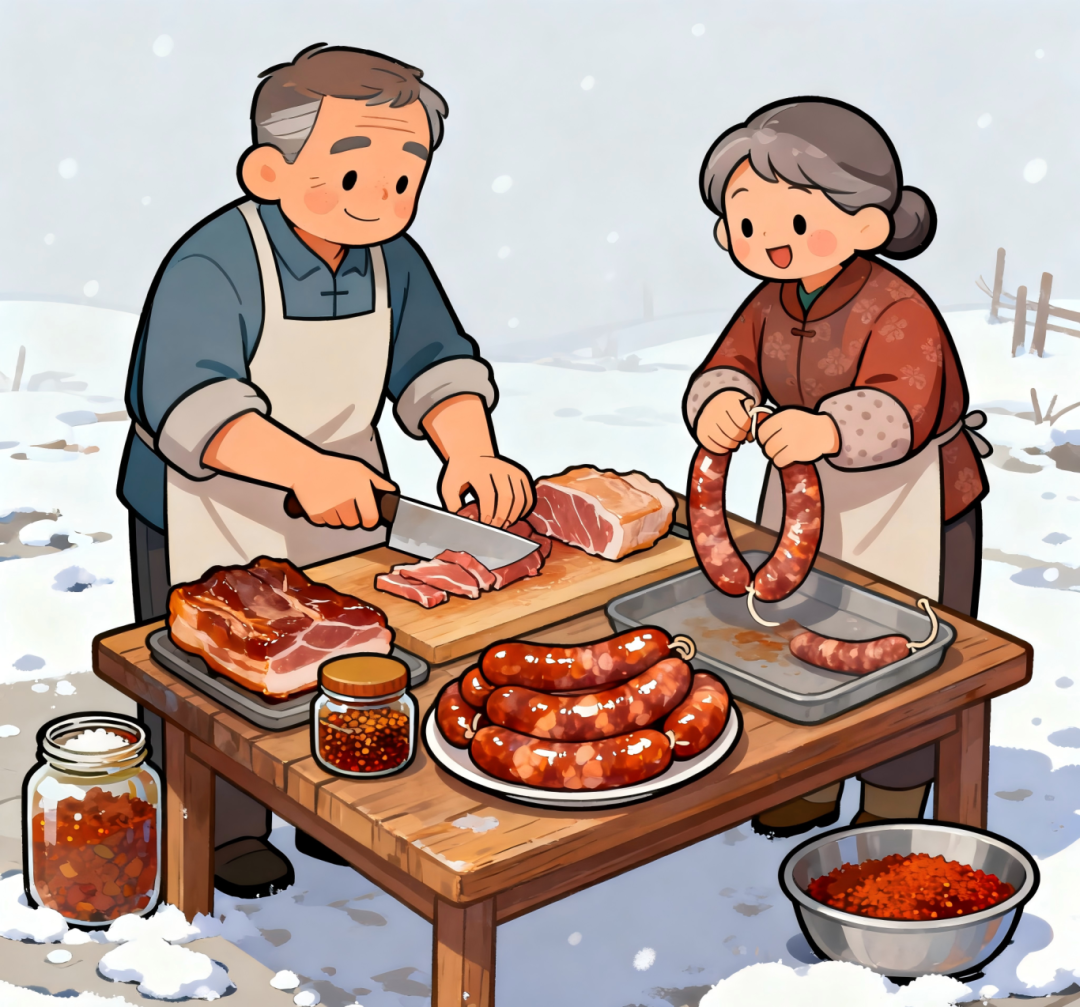 小雪節(jié)氣,意味著天氣會越來越冷。民間有“冬臘風腌,蓄以御冬”的習俗,不少人家開始動手做香腸、臘肉,待到春節(jié)時享用美食。而在南方某些地方,還有農(nóng)歷十月吃糍粑的習俗。